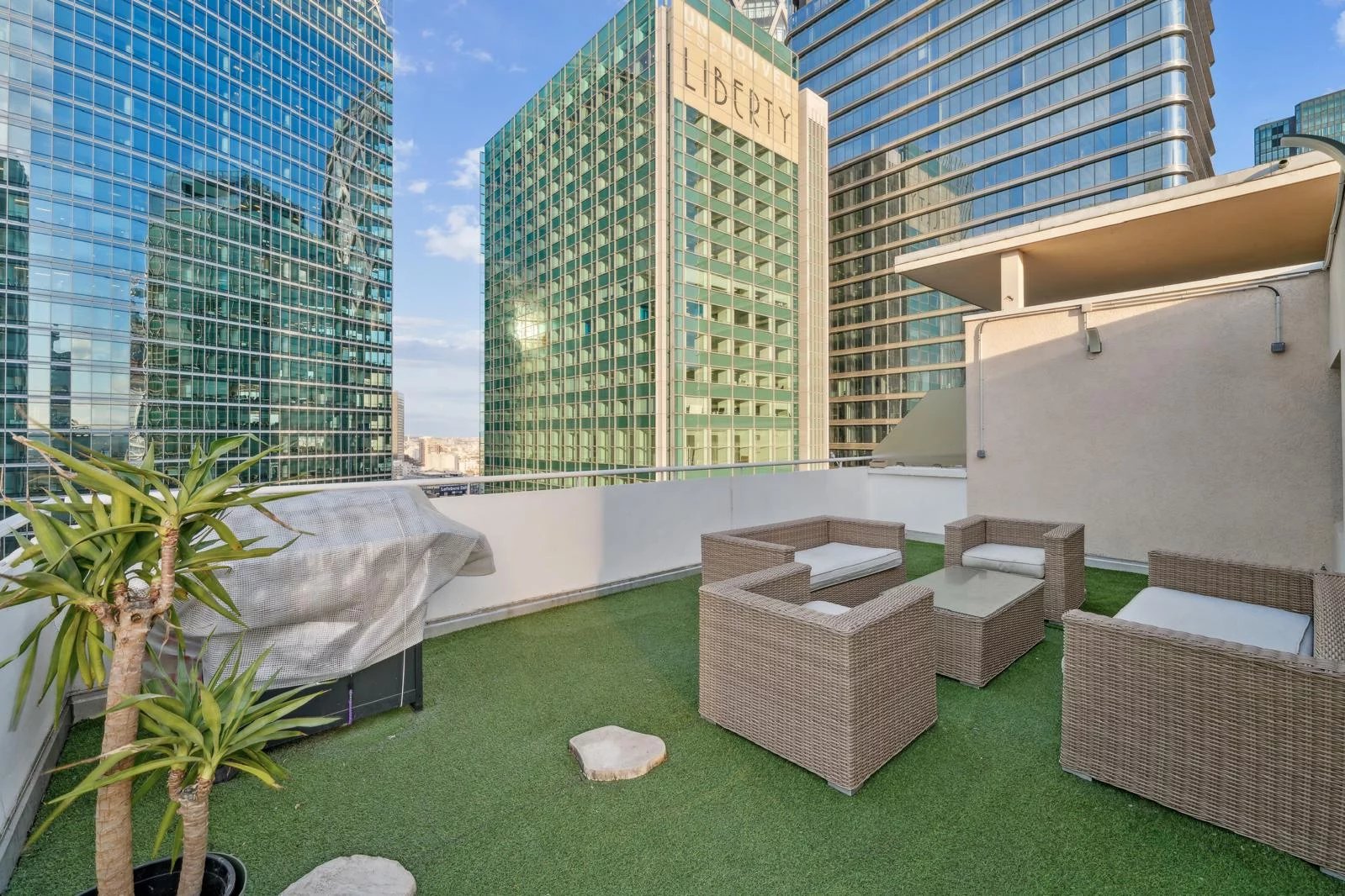 Au cœur d'un lieu incontournable de la Défense, réputé pour ses nombreux restaurants, cafés et espaces de détente implantés au milieu de cerisiers du japon et de fontaines lumineuses, ce duplex de 209 m² avec terrasse, situé au dernier étage d'un immeuble avec gardien, offre une vue spectaculaire sur l'Arche de le Défense et les différentes tours. Le bien se compose aujourd'hui au premier niveau, d'un grand studio séparé d'environ 35 m², entièrement équipé, ouvrant sur un balcon exposé ouest, sans vis à vis. Le niveau supérieur d'environ 177 m², ouvert sur une grande terrasse de 85 m² baignée de soleil, sans vis à vis, comprend un grand séjour de 56 m², une salle à manger, une cuisine ouverte, aménagée et équipée, trois chambres et deux salles d'eaux. Dressings et toilettes séparées. Une cave complète ce bien. Travaux à prévoir.