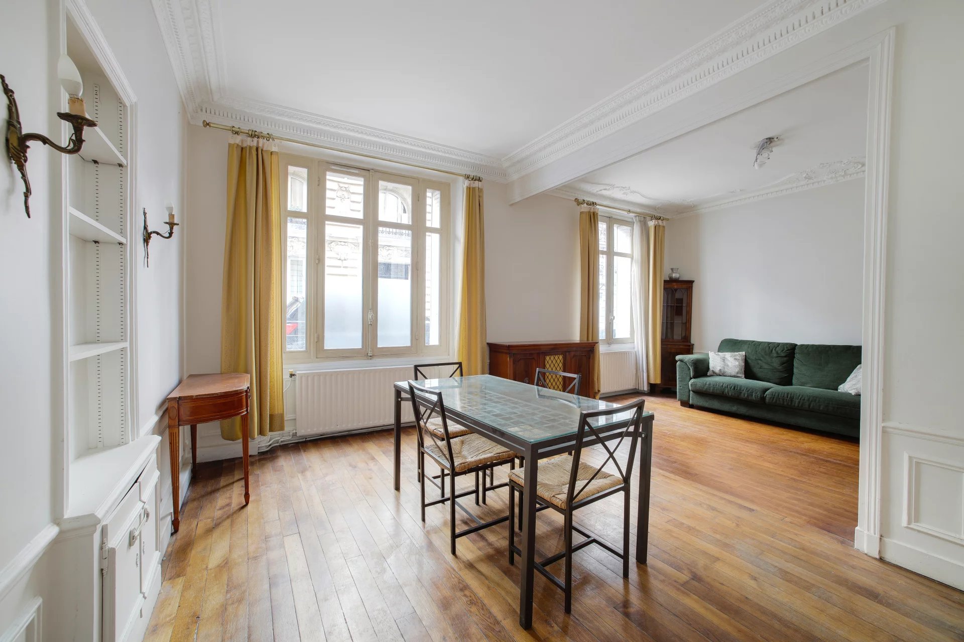Dans une rue calme entre la Mairie du 18ème et Montmartre, au rez de chaussée d'un immeuble Haussmannien bien entretenu avec gardiens, un appartement 3 pièces composé d'une entrée, un double séjour exposé Ouest, une chambre au calme sur cour (possibilité deuxième chambre), une cuisine indépendante (possibilité cuisine U.S.), une salle de bains, un w.-c. séparé, un dressing. Au sous-sol, une cave. Parquet, moulures, cheminée, 3 mètres de hauteur sous plafond.